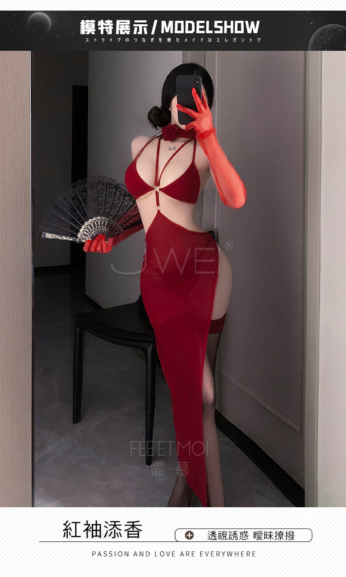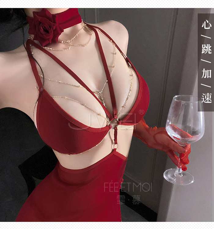 雙色嬌妻.迷迭花樣掛脖頸環美背側高衩網紗睡裙-紅【頸環+連身裙+內褲】
