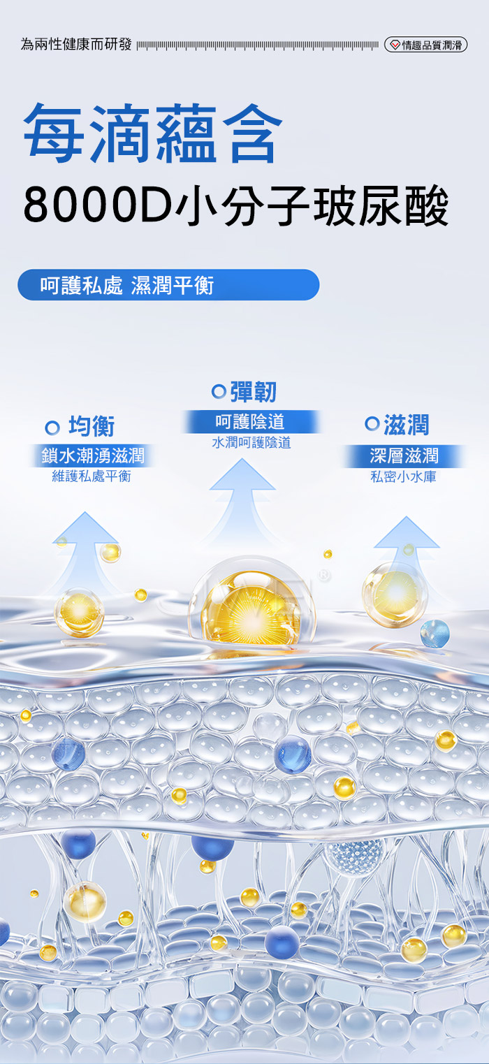 每滴蕴含8000D小分子玻尿酸,呵護私處濕潤平衡,讓補水更直達深處