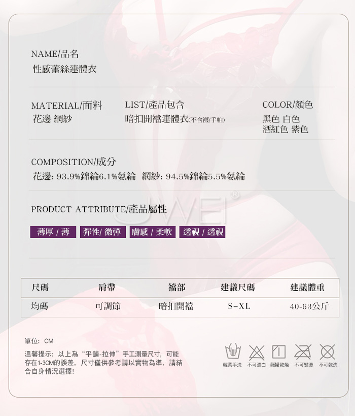 ■內容物:單件連體衣 ■適穿尺寸:FREESIZE ■彈性:微彈 ■未撐開平量尺寸正負誤差1~2cm,1吋=2.54cm ■注意事項:基於保障消費者個人衛生,此貼身衣物恕不接受退換貨。 (如為商品本身暇疵,接受七日內換貨,請勿試穿,謝謝您)