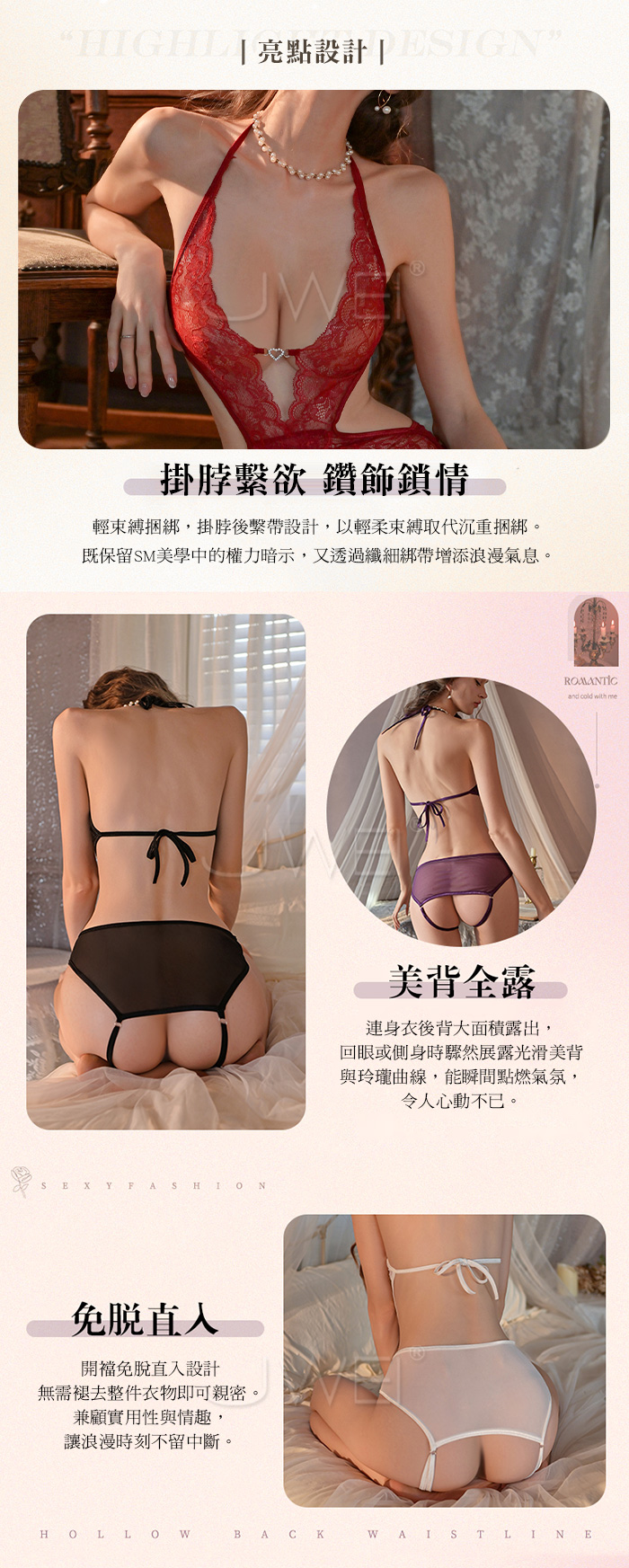 繁花似錦.深V愛心鑽飾露胸掛脖繫帶美背蕾絲開襠連體衣【白色】