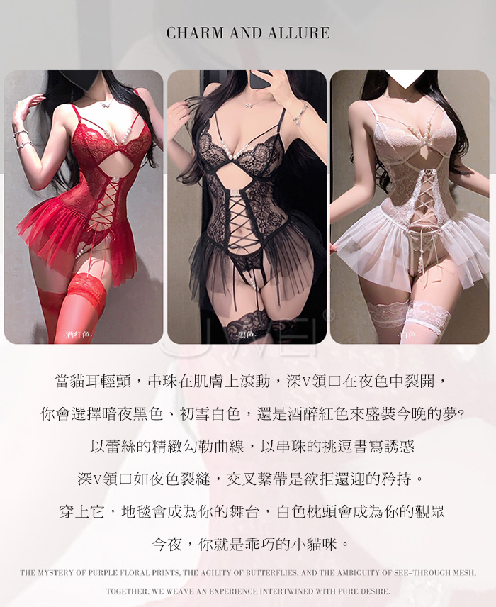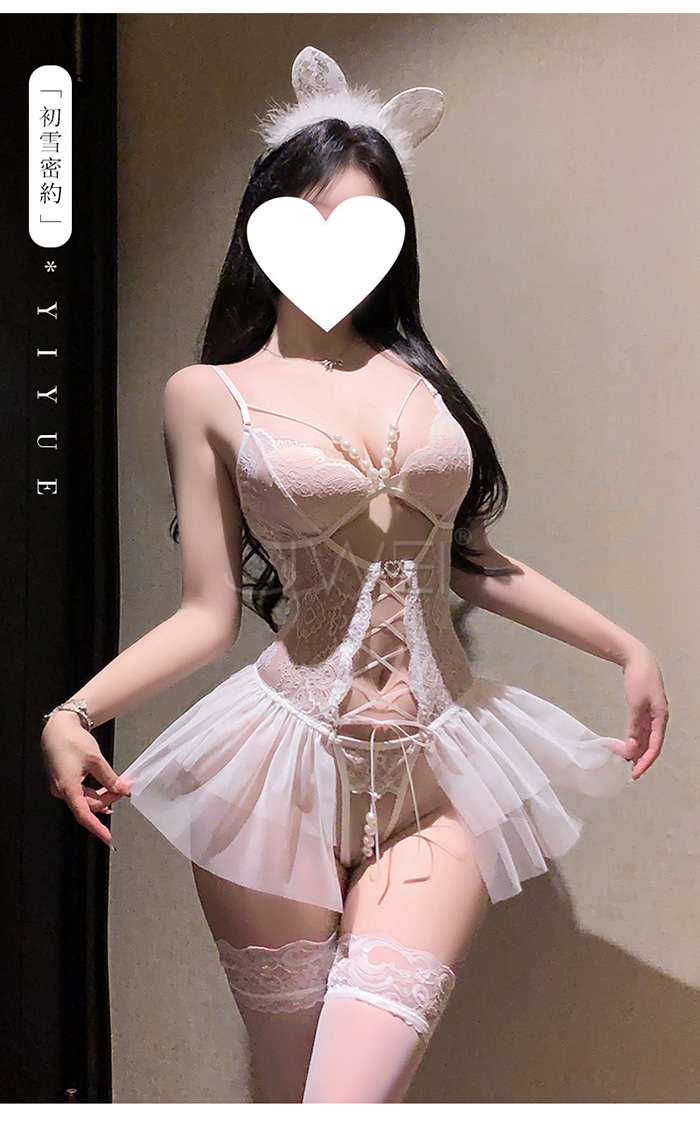 首頁>串珠織夢.深V珍珠飾胸蕾絲繫帶花邊裙擺開襠連體衣【白色】